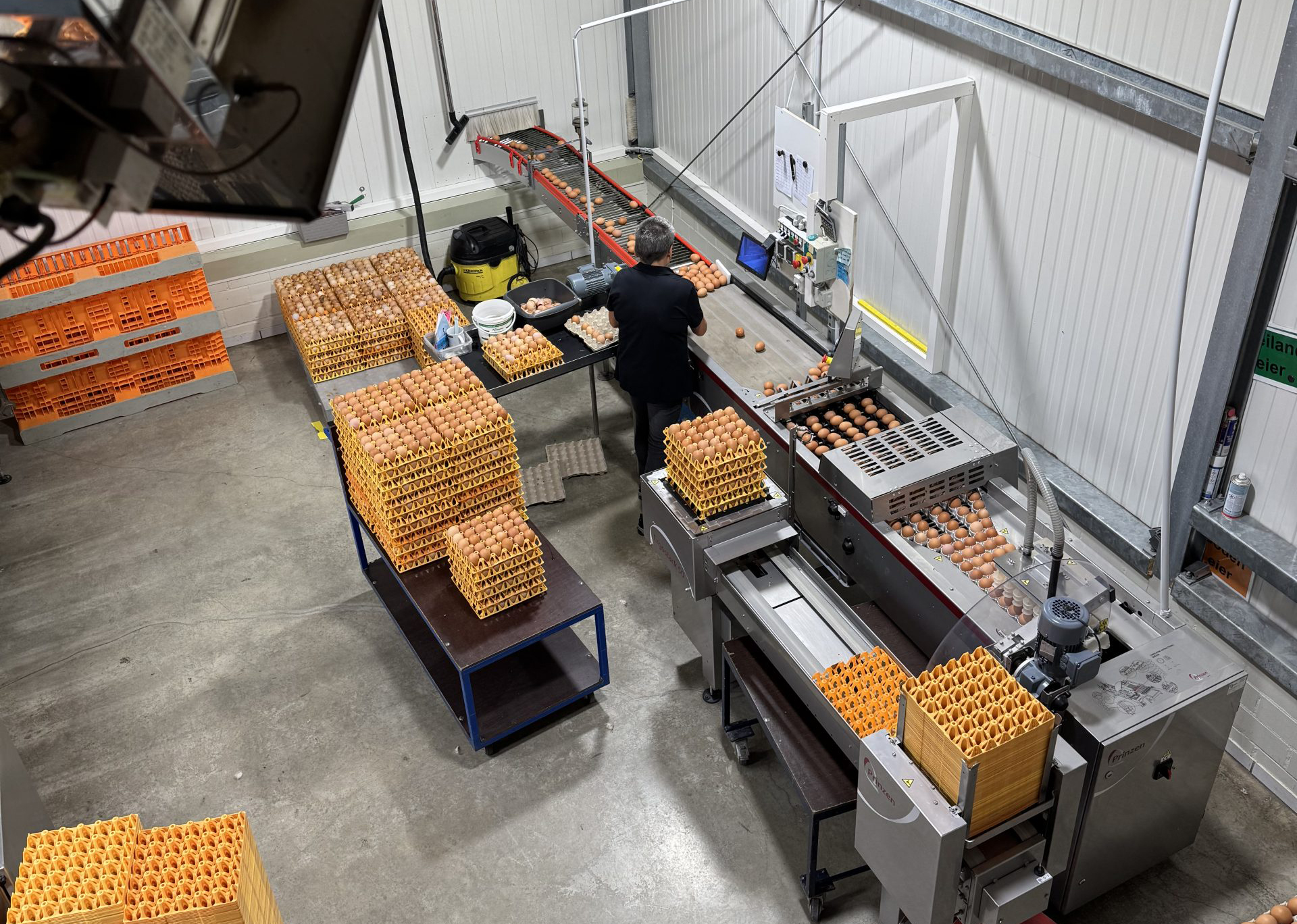 In der Packstelle werden die Eier aus allen Ställen sortiert und verpackt. Während die Eier aus den weiter entfernten Ställen manuell über den Rundaufleger in die Sortiermaschine eingebracht werden, laufen die Eier aus den direkt angebundenen Ställen direkt über ein Stäbchenband in die Sortiermaschine.