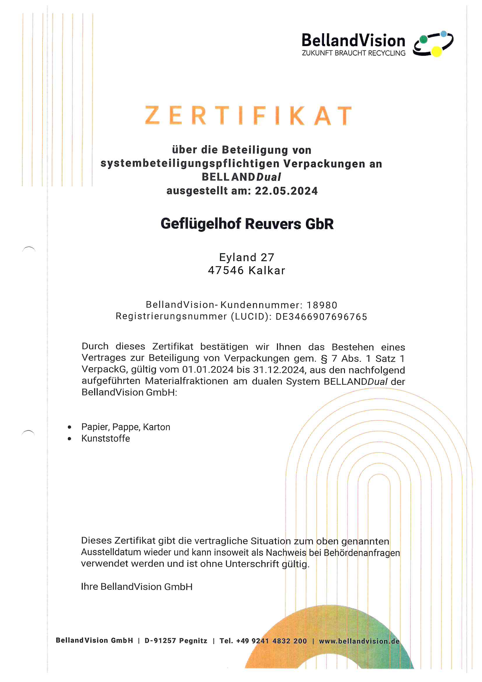 Im Verpackungsregister LUCID sind wir registriert und die Lizenzierung ist bei der BellandVision unter der Lizenznummer 18980 erfolgt. Hier die entsprechenden Nachweise: